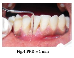 A total of 3 subjects (aged 17 to 25 years) provided sites for gingival augmentation procedures. All sited in this study were treated with free gingival graft positioned apical to the area of recession. There seemed to be significant changes in gingival thickness and height post-operatively after three months as compared to baseline (Tables.a ,b, c). The postoperative increase in width of keratinized gingiva and subsequent gingival augmentation can be appreciated in the figures below. At three months after surgery the amount of keratinized gingiva was increased with mean value 3.07±0.7 mm which was 0.07±0.2 mm at baseline. The mean values of PD remained stable without significant changes.