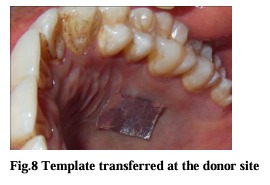 The free gingival graft was harvested from the palate. The goal was to obtain a unform thickness graft approximately 0.75 to 1 mm thick. The amount of donor tissues needed was accurately determined by using a foil template. The template was made by adapting it to the recipient site (Fig 7). The left side of the palate was selected by measuring the thickness of the tissue using an endodontic file with a stopper. The area between the first premolar and first molar (Fig 8) was selected to obtain the desired tissue.The initial incision was outlined by the placement of the tinfoil template with a #15 scalpel blade. All palatal incisions were placed in such a fashion as to make a butt joint. This butt-joint margin of the graft will be butted alongside the butt joint margin in the papilla and the accentuated enamel margins at the cemento-enamel junction. A bevel access incision was made to get an even thickness of the graft. An incision was made along the occlusal aspect of the palate with # 15 scalpel blade held parallel to the tissue, continued apically, lifting and separating the graft. Tissue pliers were used to retract the graft distally as it is being separated apically and dissected, until the graft is totally freed. The graft obtained was inspected for any glandular or fatty tissue remnants. The thickness of the graft was also checked to ensure a smooth and uniform thickness. The harvested graft was placed on the recipient bed, and suture by means of interrupted sutures (4-0 black silk sutures) at the coronal and apical borders (Fig. 9 and 10). A vertical stretching suture was given for close adaption of the graft to the