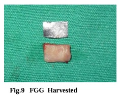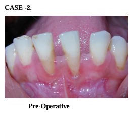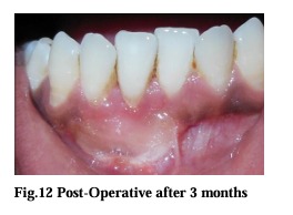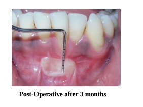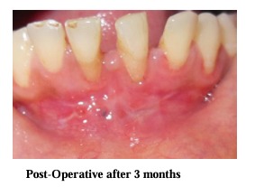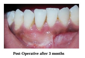 Immediately after surgery periodontal dressing was placed on the recipient site and the donor site. After surgery, a non-steroidal anti-inflammatory (Ibugesic-Ibuprofen + Paracetamol B.D for 5 days) was prescribed. No systemic antibiotics were utilized. Patients were instructed not to brush the teeth in the treated area. All patients were placed on 0.2% chlorhexidine gluconate twice daily, for one minute, for 4-6 weeks. They were instructed not to disturb the pack and to avoid to disturb the pack and to avoid undue trauma to the treated site. One week following surgery, periodontal pack was removed. At this time the healing was observed and a second periodontal pack was placed if necessary. After irrigation with saline, polishing was done with the help
