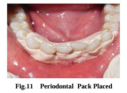 tooth surface. After suturing a periodontal dressing was placed to protect the surgical site (Fig. 11). The palatal wound was also protected by periodontal dressing and stabilized by Hawley’s retainer already prepared during the pre-surgical phase.