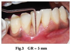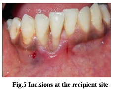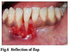After achieving adequate local anesthesia (2% lignocaine with 1:80,000 adrenaline), the exposed root surface was planed thoroughly with a Gracey 1-2 curette.After obtaining anesthesia, a releasing incision was placed between the mucogingival junction and marginal tissue with a #15 blade. At the level of cemento-enamel junction (CEJ), horizontal incisions were made extending through the line angle of neighbouring teeth on either side of the recession deep into the papilla producing a well defined butt-joint margin. Vertical incisions were given at the terminal ends of the horizontal incision, extending into the alveolar mucosa, so that it is 3 mm beyond the apical extent of the recession. Thus, recipient bed was established, by a partial thickness flap that was reflected (Fig 6) as close to periosteum as possible to create a bed preparation.